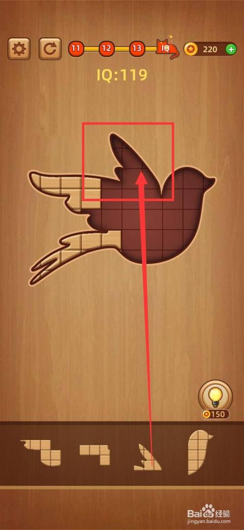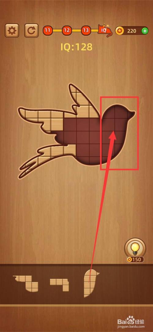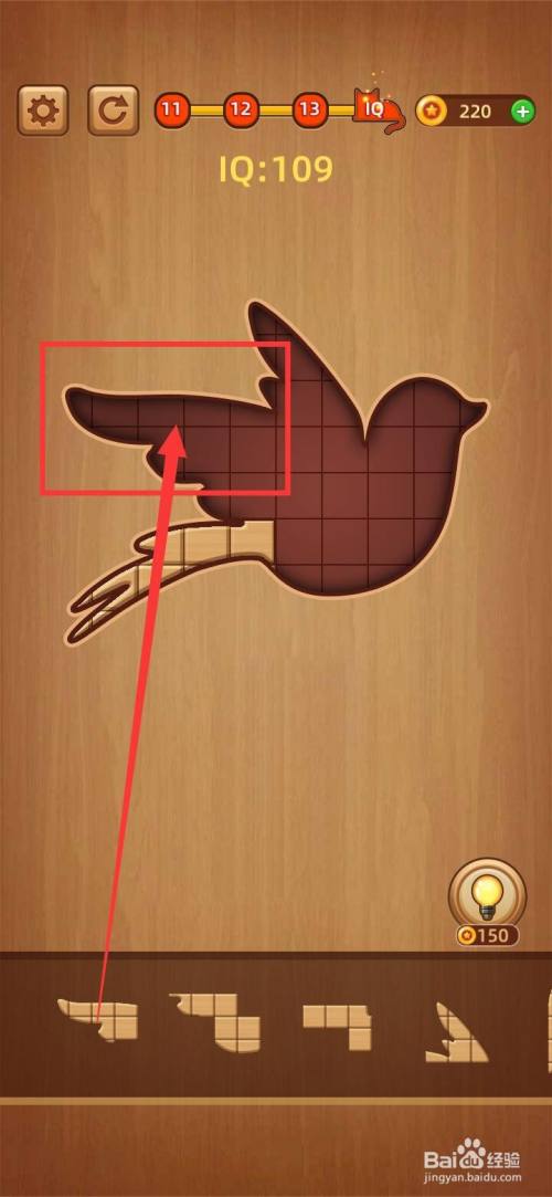 把下面第三块水滴形拼图移动到方块拼图LV.14 IQ100右上方缺口