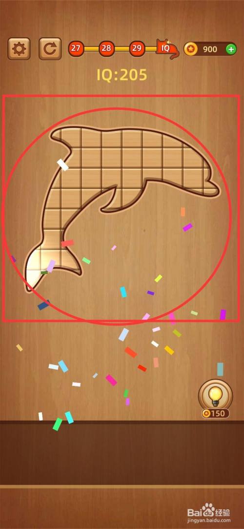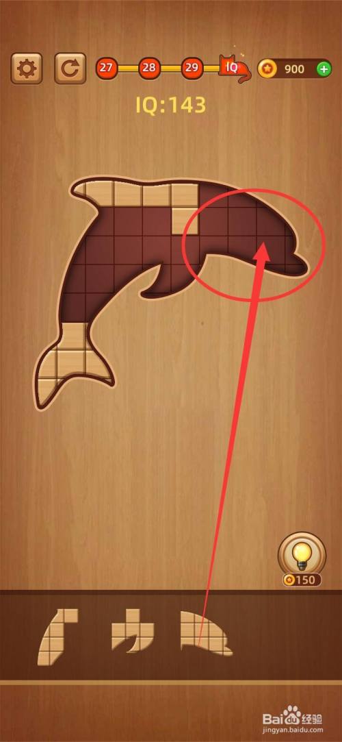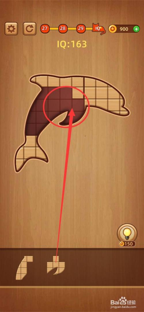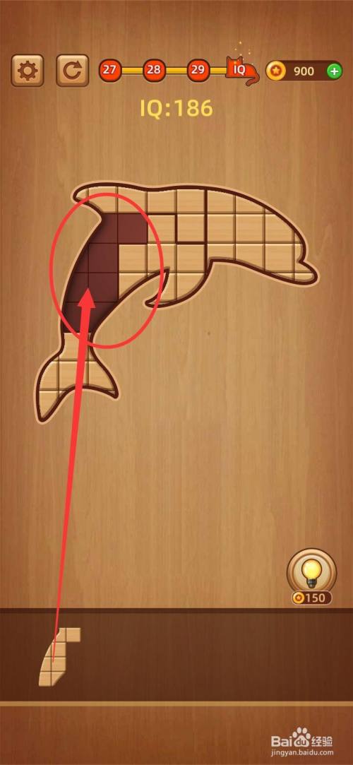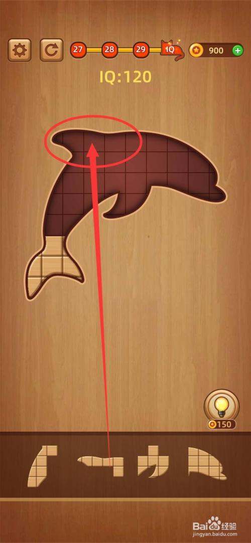 把下方第三块卵形拼图放到方块拼图LV.30IQ100的海豚头上