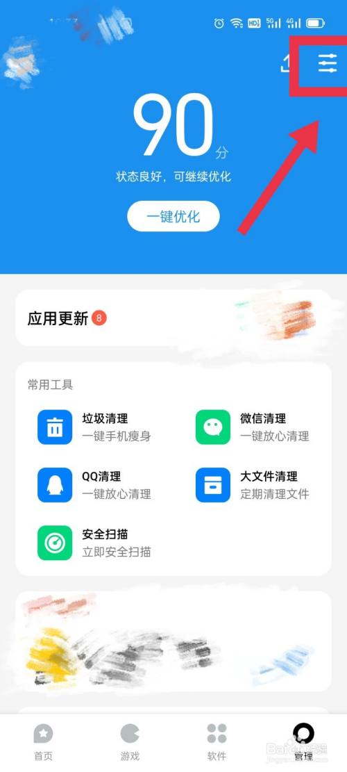 这时,在打开的一键优化页面中选择右上角的菜单选项;