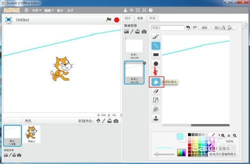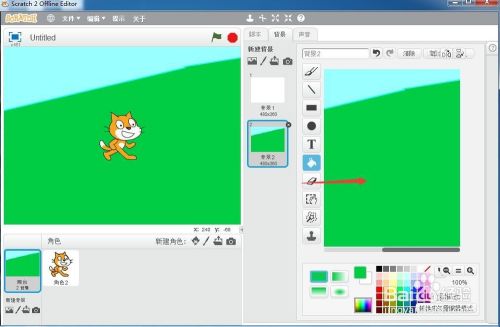 选择用颜色填充东西,在地面上点击鼠标左键,给大地填充上绿色,用这种方式,我们就可以在scratch中本身建立布景。