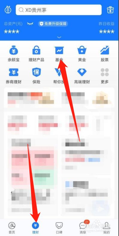 第二步、点击下方的理财,任何点击上方的基金菜单