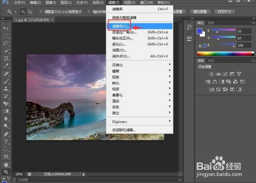 点击滤镜菜单,在打开的下拉菜单中点击滤镜库;