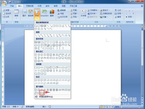 1、打开word,点击插入菜单,选择外形;