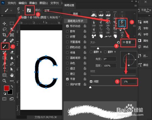 4.如下图所示点击画笔东西,选择毛绒状的笔刷样式,将参数调整为35像素大小,1%间距