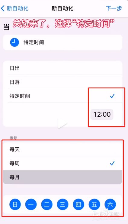 5、进入特按时间设置后,选择时候及反复日期。