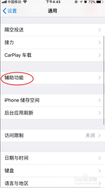 在通用页面往下放滑动一点点,找到辅助功能,点击打开。