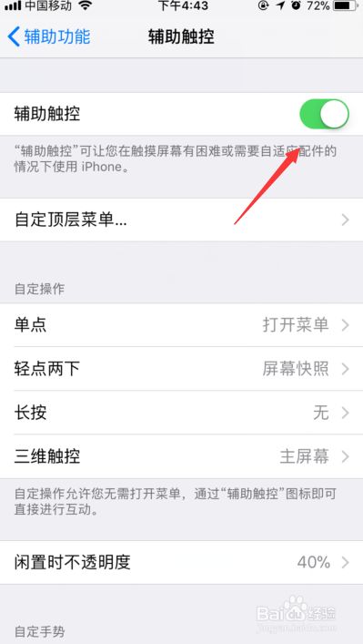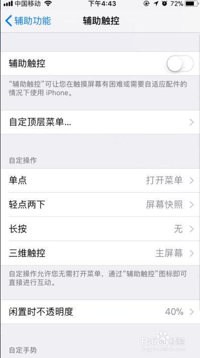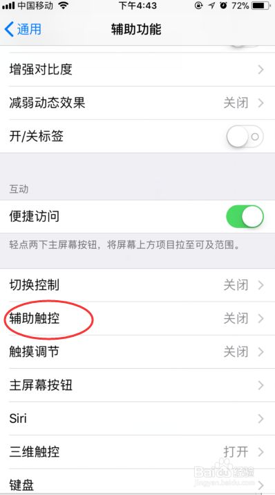 在辅助功能页面下方有辅助触控,右边显示是封闭状况。