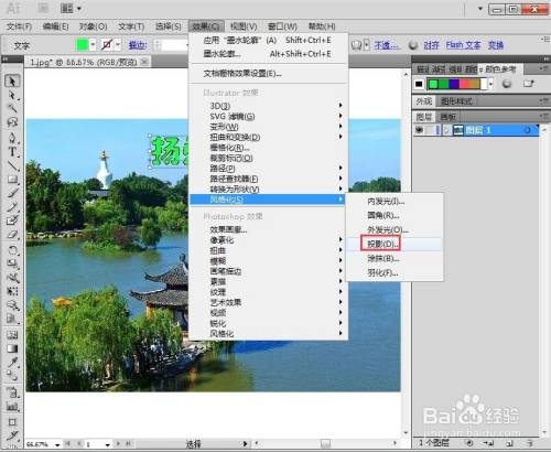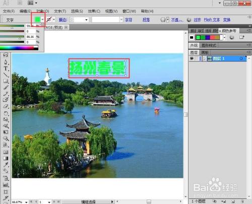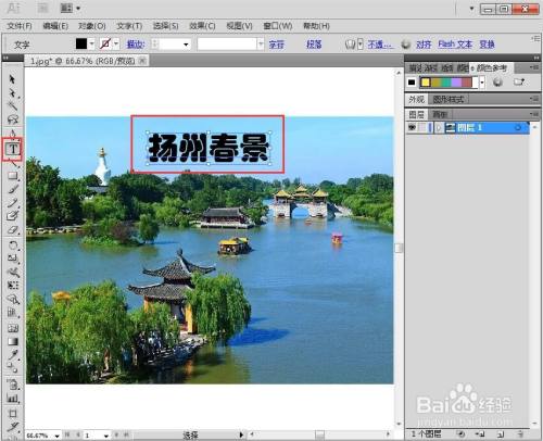 点击文字东西,设置好字体、字号,输入扬州春景;