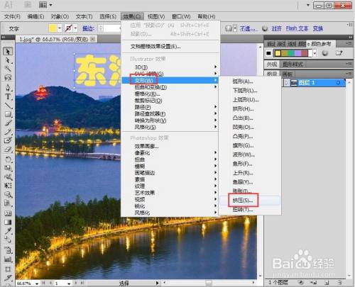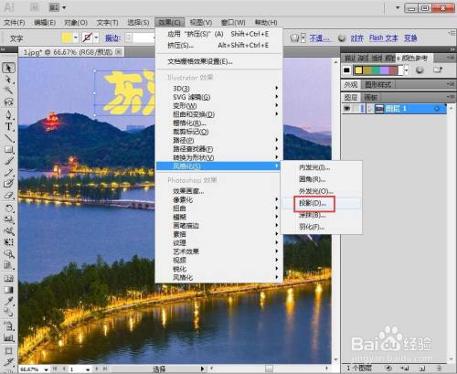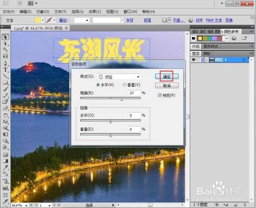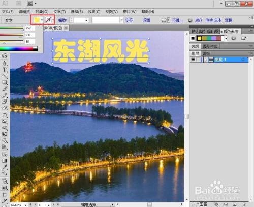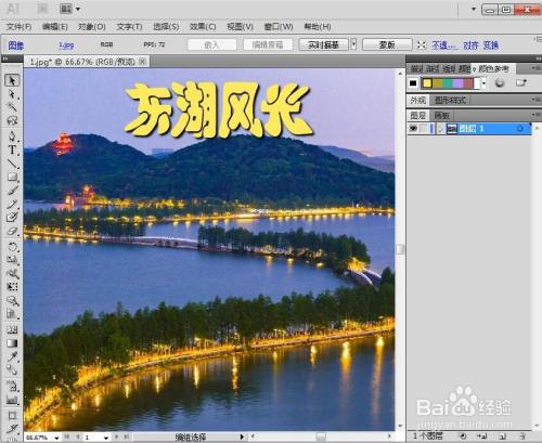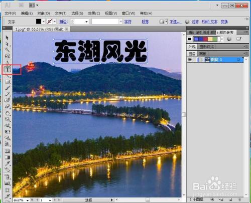 点击文字东西,设置好字体、字号,输入东湖风光;