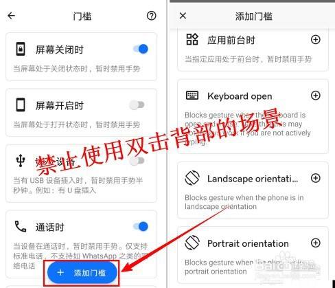 6.“门槛”就是当手机处于某些场景中时将禁止利用双击背部功能,好比可以设置熄屏、通话、打开键盘、打开某个应用等时将禁止利用双击背部功能,如下图所示: