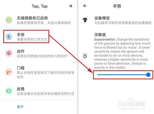 7.点击【手势】,可以调整双击背部的体例和活络度,如下图所示: