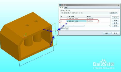 4、返回【注释特征】对话框,点击【添加】,然后在弹出的【添加注释】对话框中选择【从动尺寸】,点【确定】