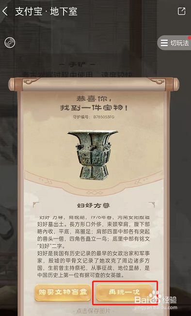 6.清扫四次摆布即可挖掘出文物,上面有关于这件宝贝的详情内容,您可以选择采办盲盒,也可以点击再玩一次查看更多宝贝信息。