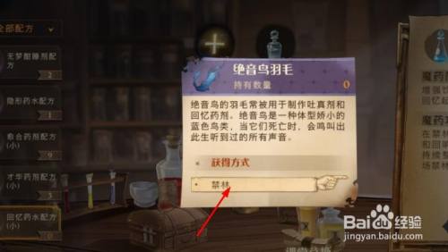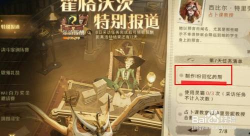 工具/原料华为p50HarmonyOS2.0.0哈利波特魔法醒觉1.20.2330方式/步骤1哈利波特霍格沃兹出格报道活动10.7第七天采访的是:西比尔.特里劳点击2对话后接到下一个使命:建造1份回忆药剂3点击使命指引来到熬药界面就可以看到回忆药剂4配方需要100讲堂积分兑换,要收集的材料里有绝音鸟羽毛5熬制当作功一份回忆药剂即可完当作使命攻略1END