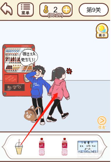 工具/原料联想小新13window10方式/步骤1首先我们先打开男本家儿旁边的背包2然后拿到背包里面的三枚硬币和车票3接着三枚硬币都拿到主动售卖机换取饮料4随后将奶茶递给女伴侣喝5等女伴侣稍微沉着下来之后再切换到右边的场景6最后再改签一下车票即可END