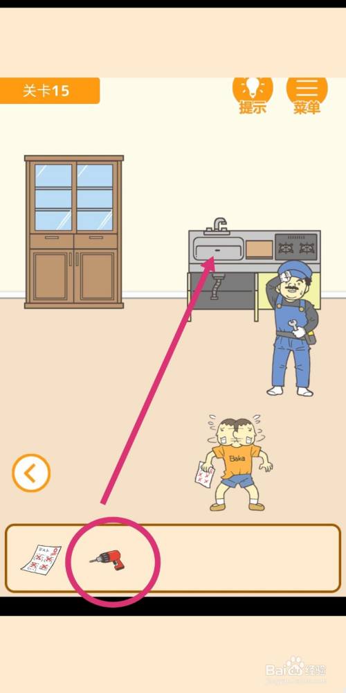 进入右侧场景,点击拖动【电钻】对水管利用。