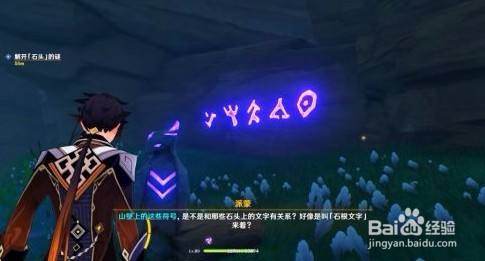 第一个用羽毛去照人物右边的鸟,然后启动出来的机关,会获得机关旁边坑里激活石碑的挨次,截图的时辰机关被这个脸前的大石头挡到了。