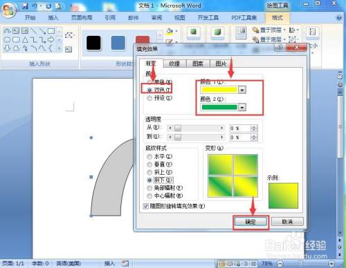 选择渐变下的双色,将颜色1设为黄色,颜色2设为绿色,底纹样式设为斜下,按确定;