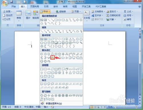 点击插入,选择外形东西,在箭头总汇类别中点击上弧形箭头;