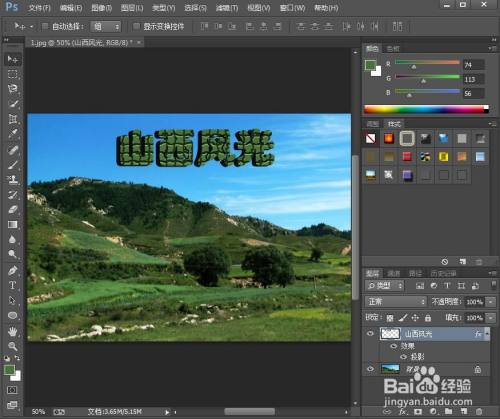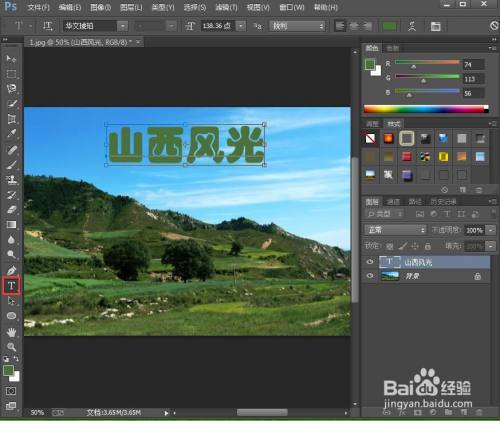 点击文字东西,将文字颜色设为绿色,输入山西风光;