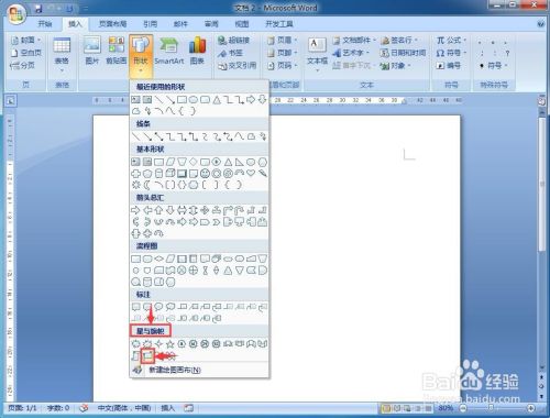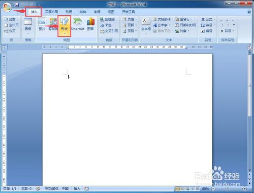 1、打开word,点击插入菜单,选择外形;