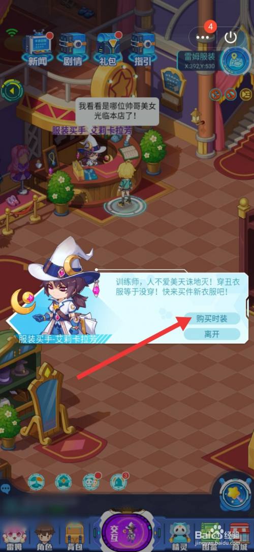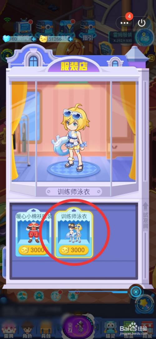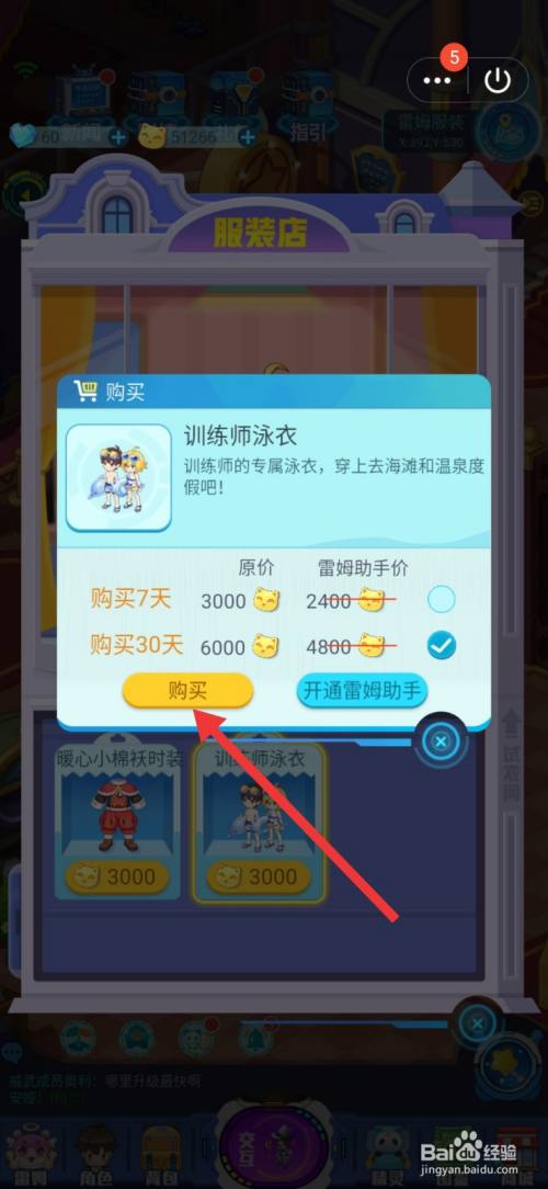 工具/原料oppoa7x安卓V.6超等精灵手表小程序方式/步骤1在雷姆中间城中,找到【雷姆服装】店肆。2进入后,点击【柜台人员】。3点击【采办服装】。4选择【练习师泳衣】。5如图;点击【采办】。6再点击【确定】,“泳衣”即可采办当作功。END