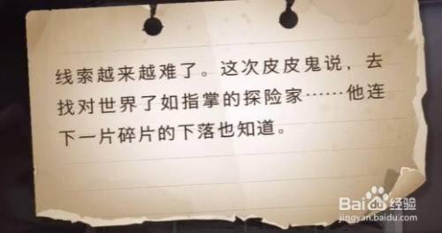 线索:线索越来越难了。此次皮皮鬼说,去找对宿世界洞若观火的探险家……他连下一片碎片的下落也知道。
