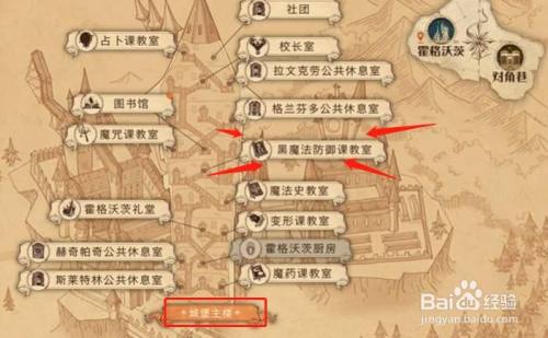 1、首先先来到城堡本家儿楼,然后打开地图进入给黑魔法防御课教室。