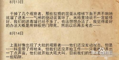 覆灭几个怪物后,前方右手边的桌上,获得文件“撕失落一半的笔记本”与弹药补给。