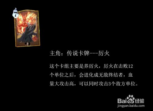 这个卡组本家儿如果养厉火,厉火在击败12个单元之后,会进化当作无敌终结者,血量大进犯高,可以同时进犯3个敌地契位。