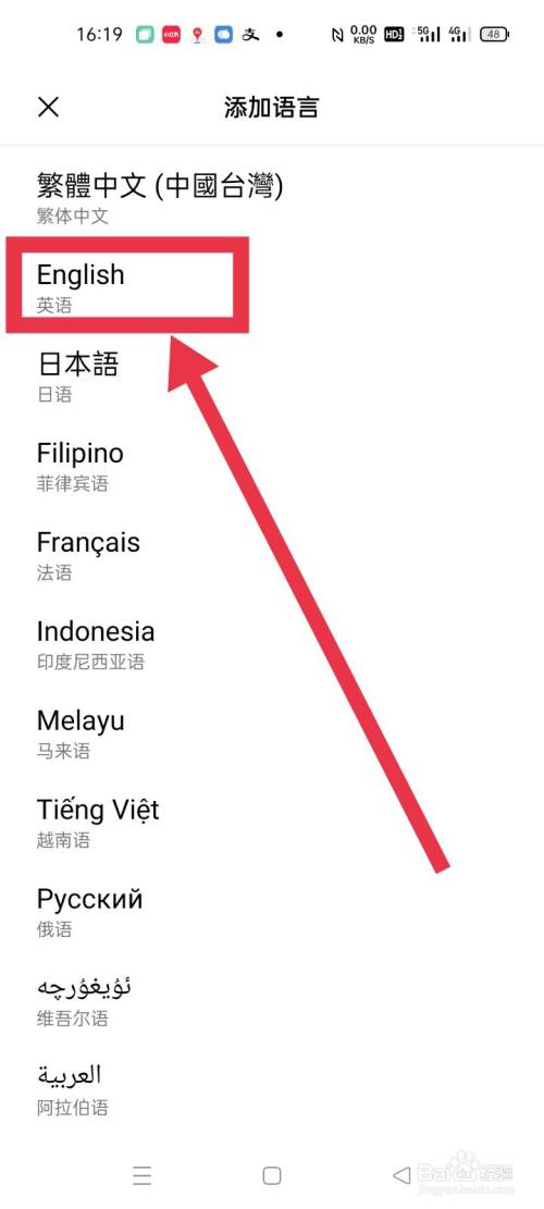 在添加说话页面,包含了今朝手机自带的所有国度说话,我们选择此中一个即可,如本文的English。