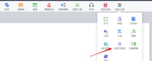 1、打开或者新建一个白板文件,点击东西栏中的学科东西,然后鄙人拉菜单中点击选择“化学方程式”。