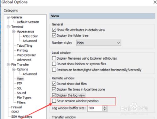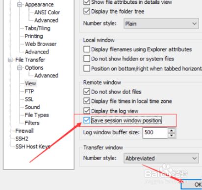 6、勾选上 save session window postion 选项之后,点击 确定,对当前中的设置做保留