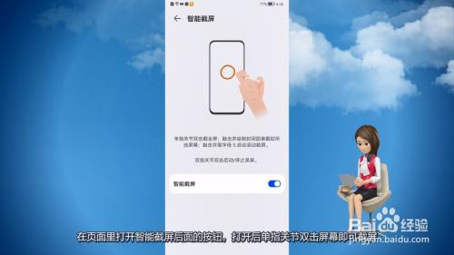 在页面里打开智能截屏后面的按钮,打开后单指关节双击屏幕即可截屏。