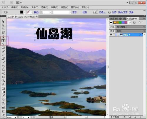 点击文字东西,设置好字体、字号,输入仙岛湖;