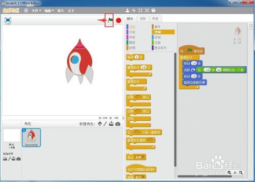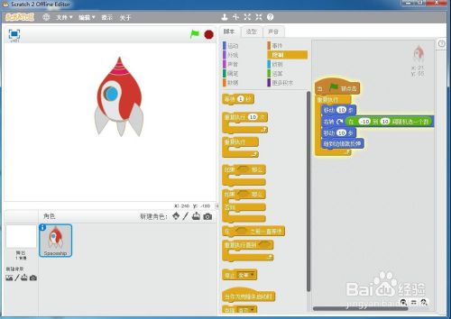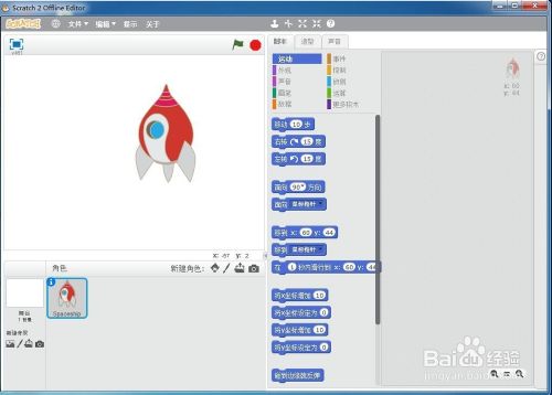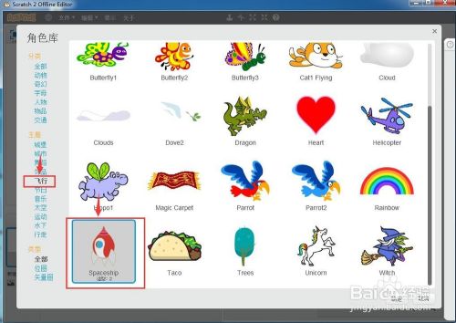 进入scratch的脚色库中,点击飞翔类别,找到并选中需要的宇宙飞船图片;