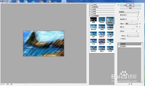 设置好参数,将描边长度设为34,描边细节设为12,纹理设为画布,缩放设为145%,凸现设为43,然后按确定;