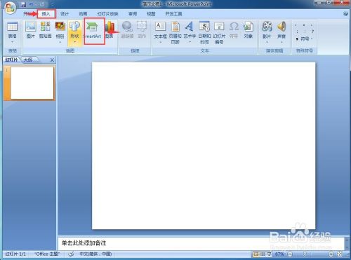 1、打开powerpoint,点击插入菜单,选择smartart东西;