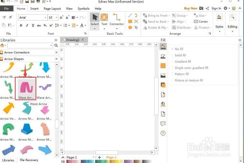 2、进入箭头外形符号库中,找到波形箭头,用鼠标将其拖放到编纂区;