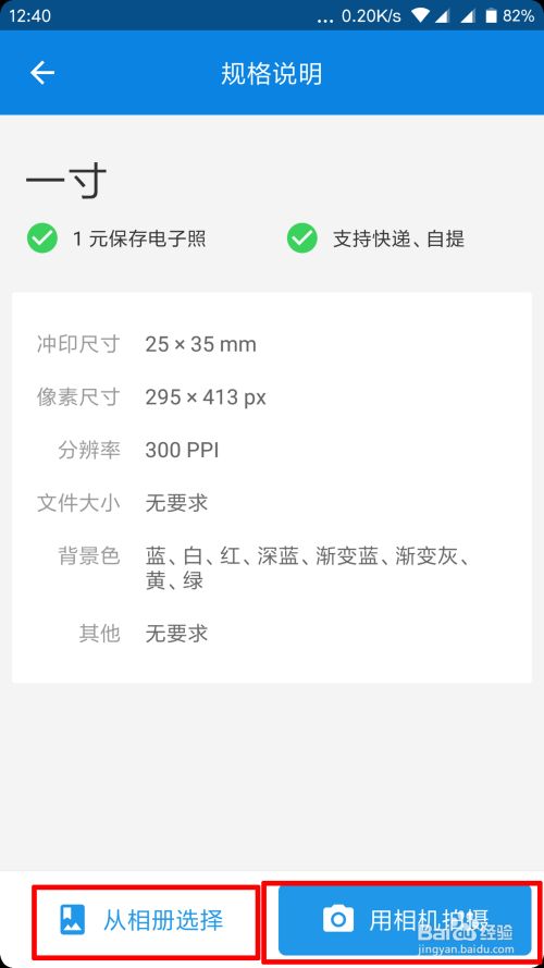 小编以一寸的证件照做示范,下边有两个选项,可以先把照片拍好了,在直接上传进行点窜。