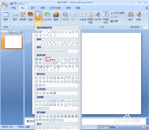 点击插入菜单,选择外形东西,在根基外形中选择三角形;