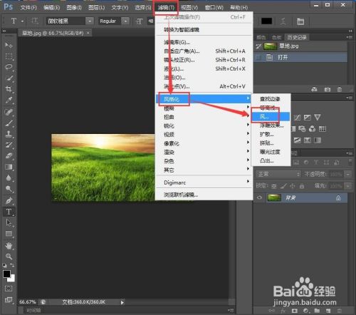 选择滤镜,找到气概化里的风,选中它;