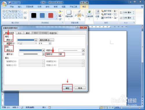 将填充颜色和线条颜色设置为蓝色,将线条粗细设为5磅,然后按确定;
