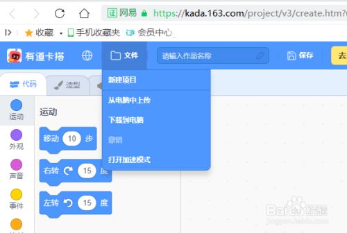 3、在打开的scratch文件里点击文件按钮,在接下来的下拉菜单里选择从电脑上上传。