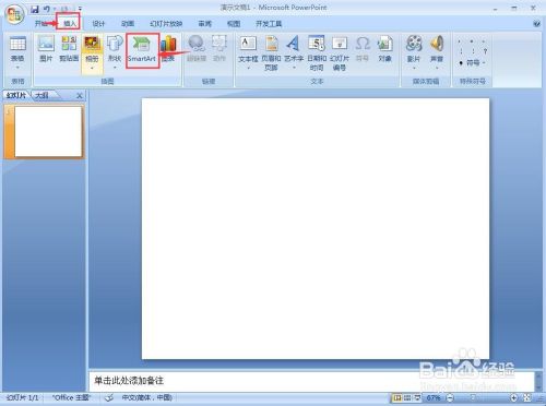 1、打开Powerpoint 2007,点击插入,选择SmartArt;
