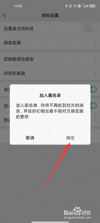 在资料设置页面点击【拉黑】,在弹出的窗口中点击【确定】。