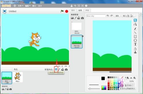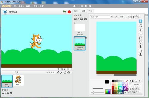 1、打开scratch2.0,添加蓝天布景;