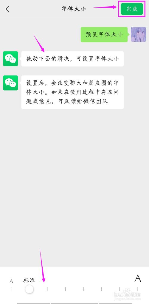 在“字体大小”页,按照提醒,在页面下方移动滑块,调整字体大小,找到合适的大小后,点击页面右上角的“完当作”即可。
