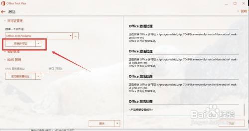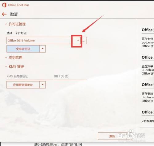 七、点击许可证下拉三角符号,选择office 2016 volume