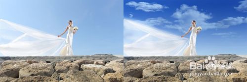 然后把找好的天空素材移到照片里,移到合适的位置。